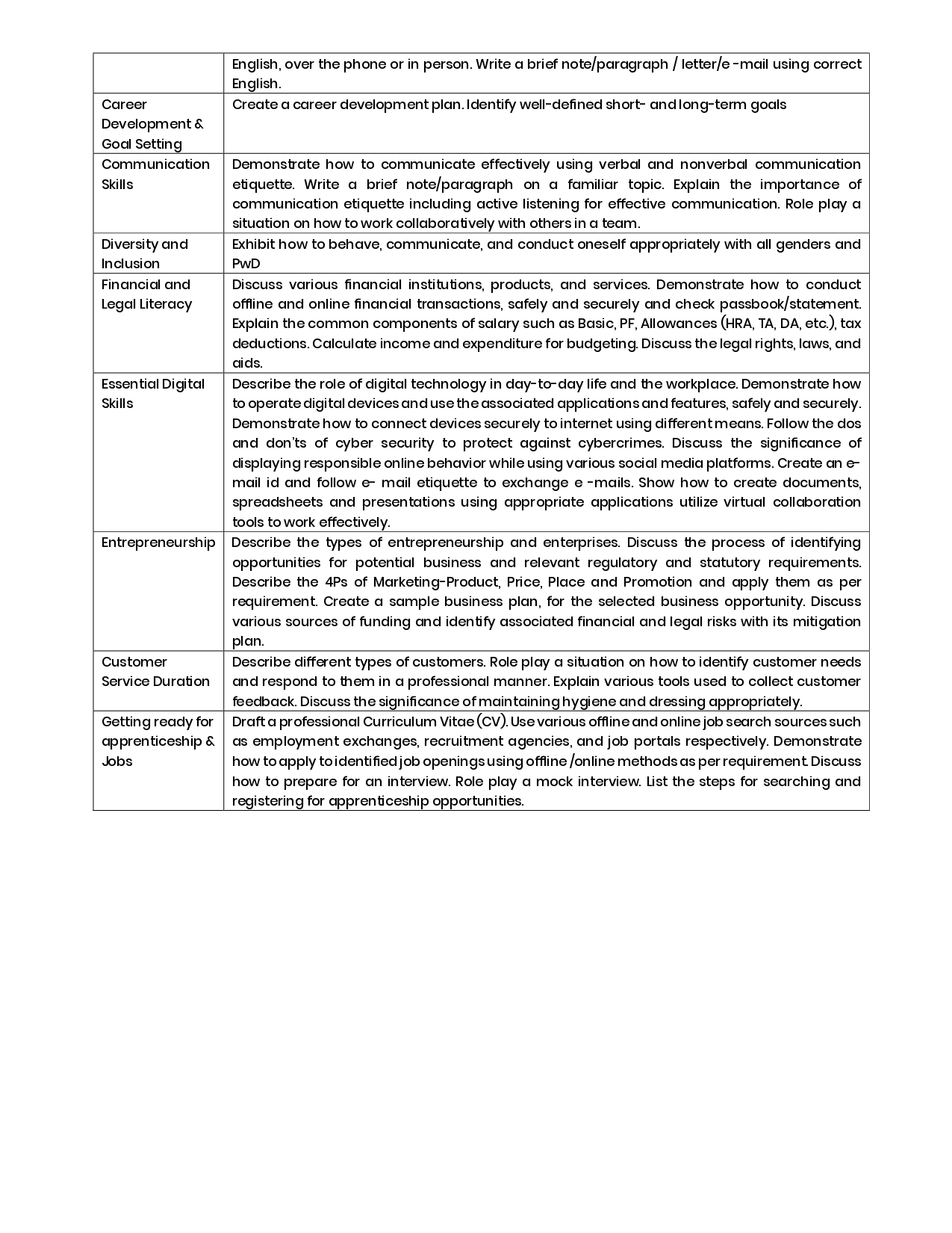 • Employability Skills including Basic English, Career Development, Communication Skills, Diversity and Inclusion, Digital Skills, Entrepreneurship, Customer Service, Apprenticeship & Job Preparation