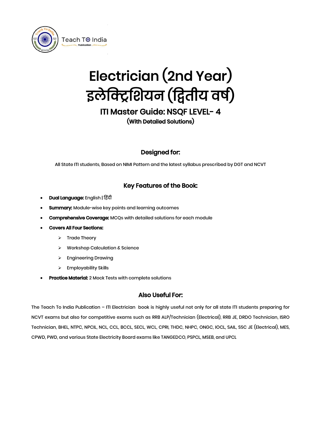 The Teach To India ITI Master Guide for Electrician Second Year is designed to help students succeed in both academic exams and skill-based preparation. It follows the latest syllabus of NCVT, DGT, and NIMI, and is structured for easy understanding and practical application. Each module includes a summary and MCQs with detailed solutions to ensure quick revision and exam readiness.