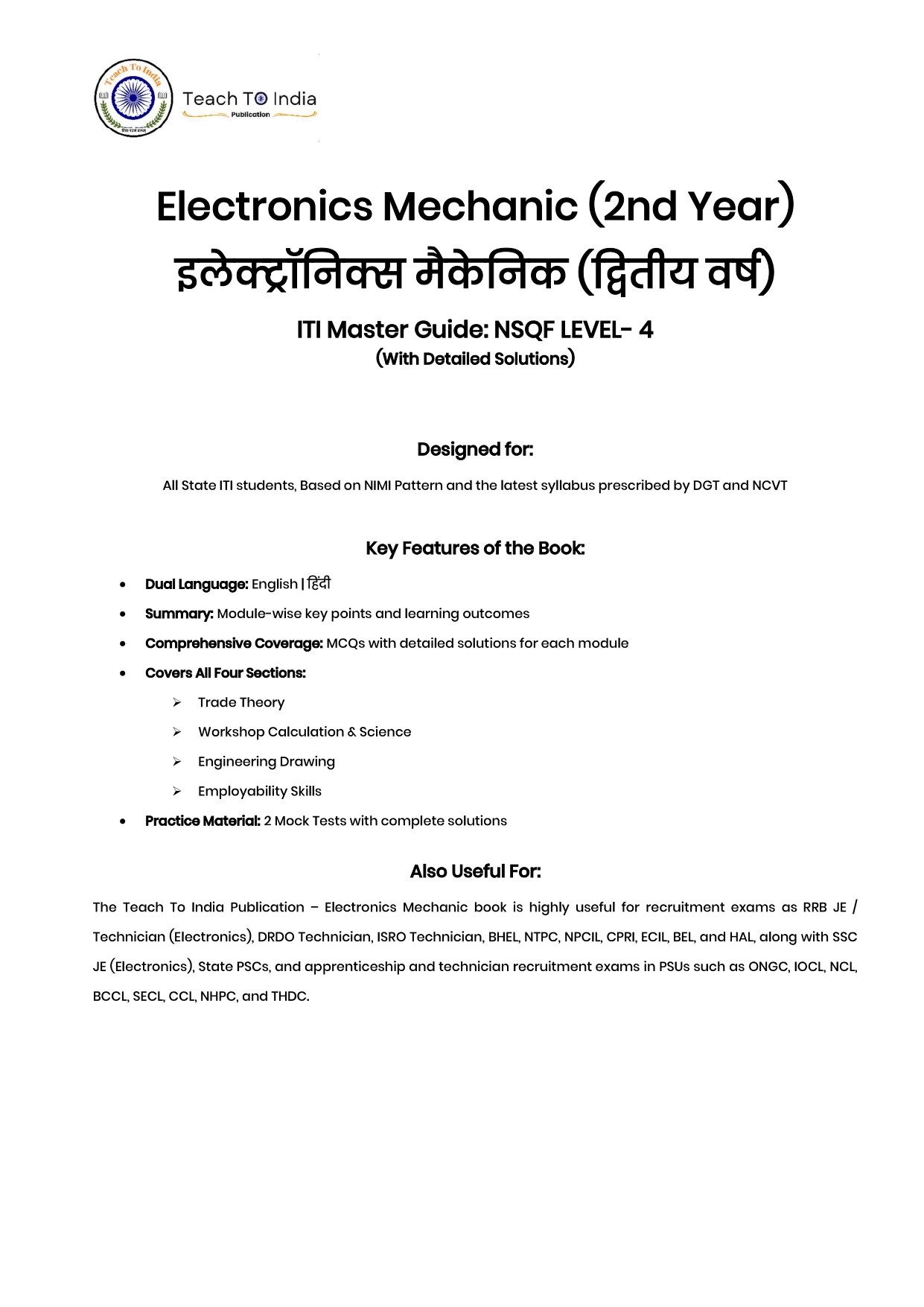 Apart from ITI NCVT exams this book is also useful for competitive and recruitment examinations such as RRB JE Technician Electronics DRDO Technician ISRO Technician BHEL NTPC NPCIL CPRI ECIL BEL HAL SSC JE Electronics State PSCs Apprenticeship and various PSU Technician Exams like ONGC IOCL NCL BCCL SECL CCL NHPC THDC.