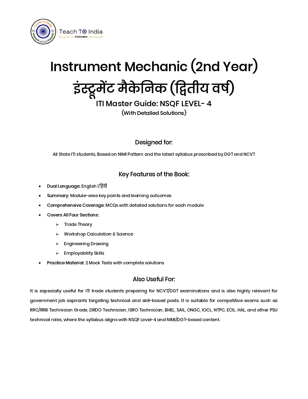 The Teach To India ITI Master Guide for Instrument Mechanic is designed to help students succeed in academic exams and job-oriented preparation. This book follows the latest NCVT, DGT, and NIMI syllabus and is structured for easy understanding and practical application.