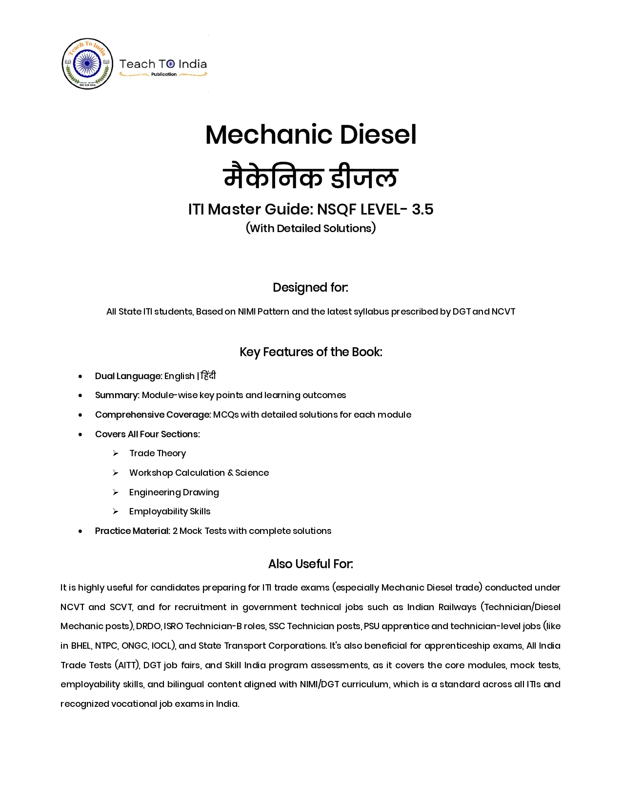 Also useful for NCVT and SCVT trade exams (especially Mechanic Diesel) and for recruitment in government and PSU technical roles such as: