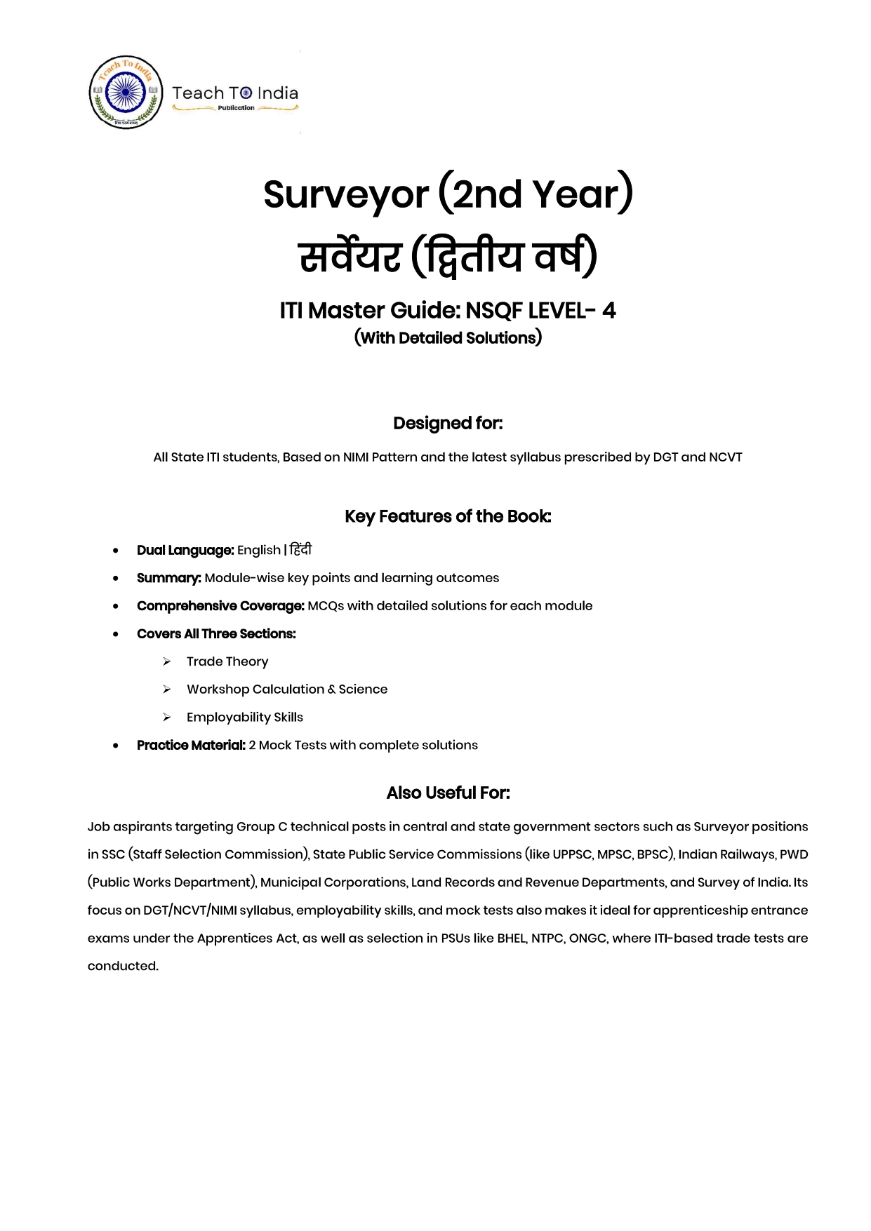 The Teach To India ITI Master Guide for Surveyor is designed to help students succeed in both academic exams and job-oriented preparation. This guide follows the latest NCVT, DGT, and NIMI syllabus and is structured for easy understanding and practical application.
